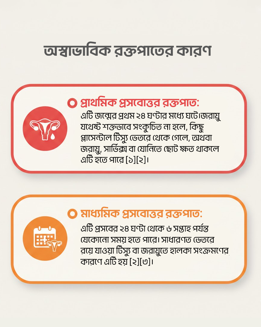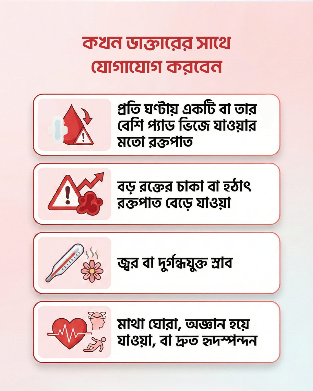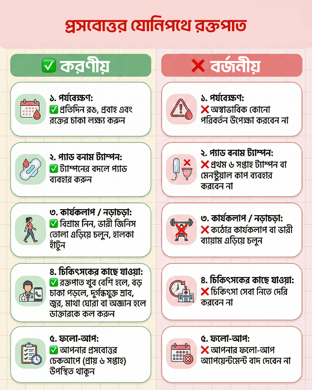 যদি কিছু অস্বাভাবিক মনে হয় তবে অপেক্ষা করবেন না: যদি আপনার নির্ধারিত ভিজিটের আগে অতিরিক্ত রক্তপাত, বড় চাকা, জ্বর, দুর্গন্ধযুক্ত স্রাব, মাথা ঘোরা বা যেকোনো হঠাৎ পরিবর্তন লক্ষ্য করেন, তবে অবিলম্বে আপনার ডাক্তারকে কল করুন বা হাসপাতালে যান।[৪][১০]