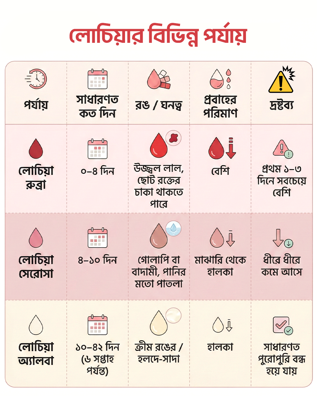 প্রসবোত্তর রক্তপাত বা লোচিয়া হলো সুস্থ হওয়ার একটি স্বাভাবিক প্রক্রিয়া। এটি সাধারণত উজ্জ্বল লাল থেকে শুরু করে ধীরে ধীরে গোলাপি বা বাদামী, এরপর ক্রীম বা সাদা রঙে পরিবর্তিত হয় এবং প্রথম কয়েক দিনে এটি সবচেয়ে বেশি হয়।[১] বেশিরভাগ রক্তপাত স্বাভাবিক, তবে খুব বেশি প্রবাহ, বড় রক্তের চাকা, দুর্গন্ধযুক্ত স্রাব, জ্বর, মাথা ঘোরা বা অজ্ঞান হয়ে গেলে দ্রুত সাহায্য চান। আপনার রক্তপাতের দিকে লক্ষ্য রাখুন এবং আপনার শরীরের প্রতি মনোযোগ দিন; দ্রুত যত্ন আপনাকে সুরক্ষিত রাখে এবং আপনার আরোগ্যকে মসৃণ করে। প্রয়োজন হলে সাহায্য নেওয়া সর্বদা সঠিক সিদ্ধান্ত।