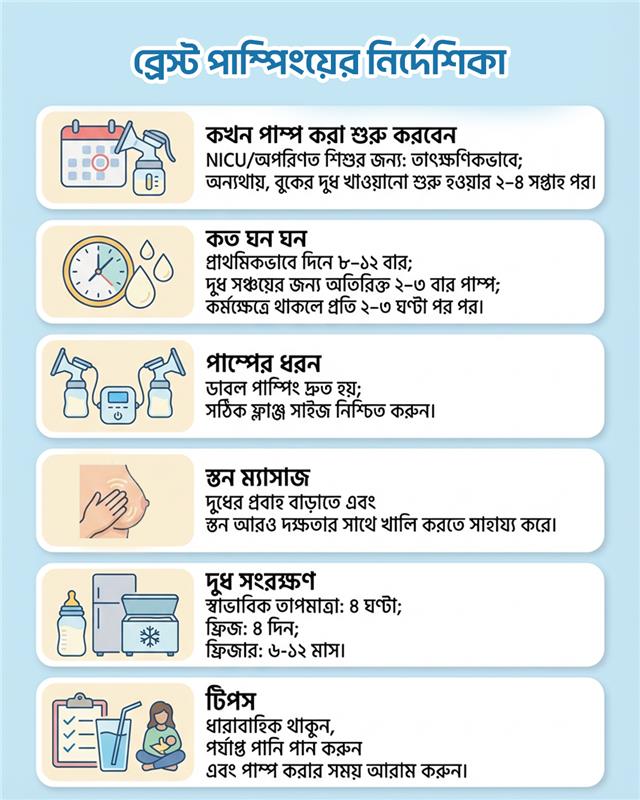 দুধের সরবরাহ বজায় রাখার জন্য প্রতি ২–৩ ঘণ্টা পর পর (দিনে ৮–১২ বার) পাম্প করা উচিত, বিশেষ করে নবজাতকের জন্য বা যখন আপনি শিশুর থেকে দূরে থাকেন।